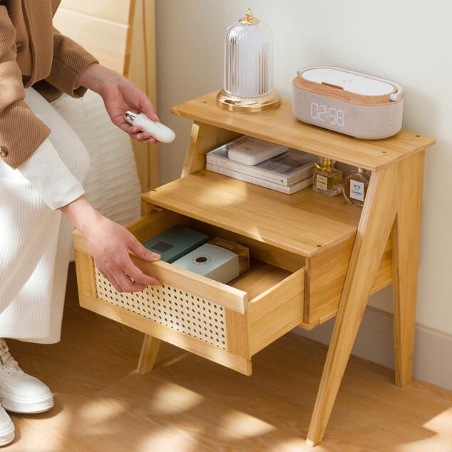 竹製フレームとラタン調素材をミックスした洗練されたデザイン ベッドサイドテーブル